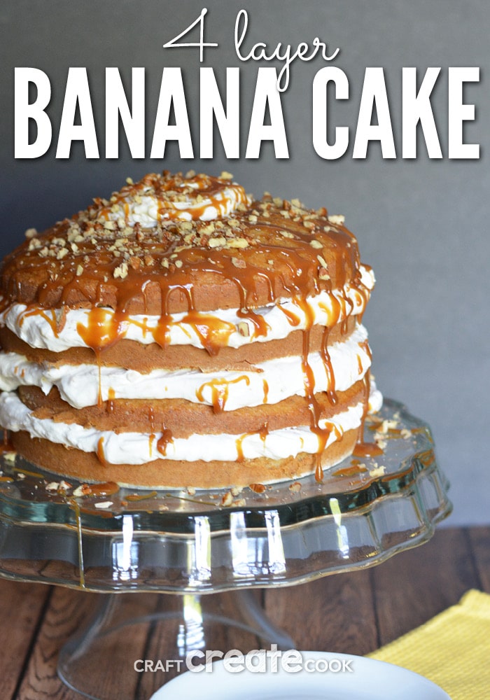 Don't be fooled by the amazing looks of this banana cake. It's quite easy to make. It's a "doctored" cake mix recipe with a semi-homemade banana cream layered in between. Plus it looks kind of "messy" in terms of cake, which is my type of recipe! That means you really cannot make a mistake. It's supposed to look that way! And if you're not a pecan lover, you can certainly omit those all together!