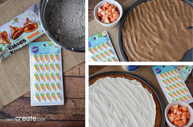 Carrot cake dessert pizza starts with a box carrot cake mix, a prepared tub of cream cheese frosting and uses some fun seasonal sugar carrot candies from Wilton and those tasty Carrot Cake Hershey's Kisses!