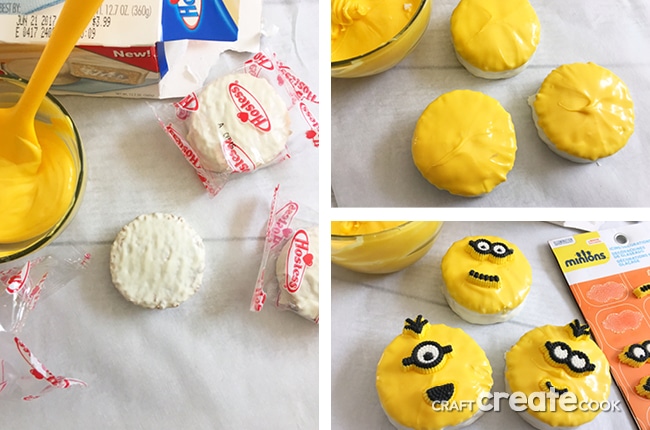 - While your chocolate is still soft, carefully peel the Minion icing decorations off the paper and place onto the yellow Ding Dongs making each one a different Minion face.