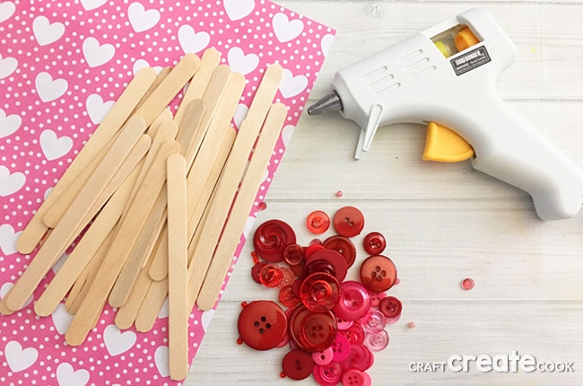 For a Valentine craft to make with the kiddos, we put together this picture frame made from popsicle sticks! Painted white and lots of buttons glued onto it, make an adorable and festive popsicle stick craft that kids can write their own little message to you, their Grandparents, or their teachers.